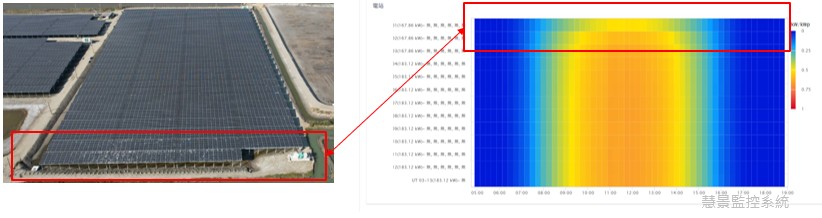 ♦模組髒污: 此案場鄰近漁塭,常有鳥類棲息。針對鳥類造成陣列的遮陰而影響發電量可協助業主進行監控。